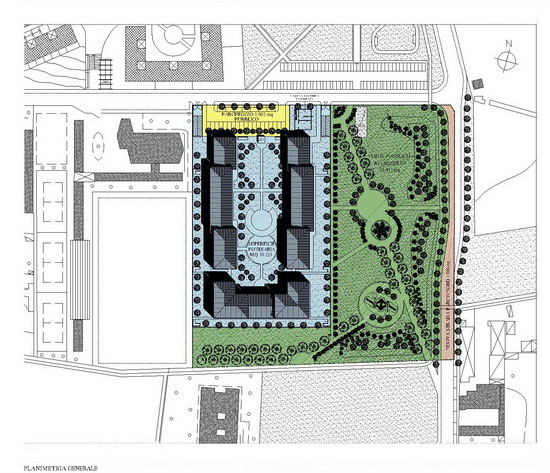 Collaborazione con lo Studio Arch. G. Perotta. Via Pozzobonelli, 6 - L'area ha una Superficie Territoriale di 24.800 mq. ed è ubicata in un contesto periferico della città caratterizzato dalla presenza storica di attività produttive e fa parte del vasto comparto urbano posto a nord della città, rimasta separata con l'avvento della ferrovia che interruppe il percorso storico porta Garibaldi. Il Programma Integrato di Intervento è finalizzato alla trasformazione del Centro di Ricerca ex Enel in insediamento residenziale e parco urbano. Il progetto planovolumetrico del P.I.I.è così definito nelle sue componenti tipologiche, funzionali e morfologiche : La bassa densità territoriale del PII consente di contenere l'altezza degli edifici da un minimo di 3 piani a un massimo in un massimo di 5 piani fuori terra, oltre il piano porticato, secondo una progressione di altezza degli edifici dalla via Pozzobonelli ( 3 piani + portico ) alla estremità opposta del lotto ( 5 piani + portico ). La disposizione dei box al piano interrato, previsti ad un solo livello e disposti perimetralmente lungo i confini del lotto, per circa 1.650 mq. con circa 158 box e 120 cantine. Verranno realizzati 104 appartamenti, in prevalenza di due / tre locali. Le aree a verde pubblico rappresentano il 50 % della Superficie di proprietà.